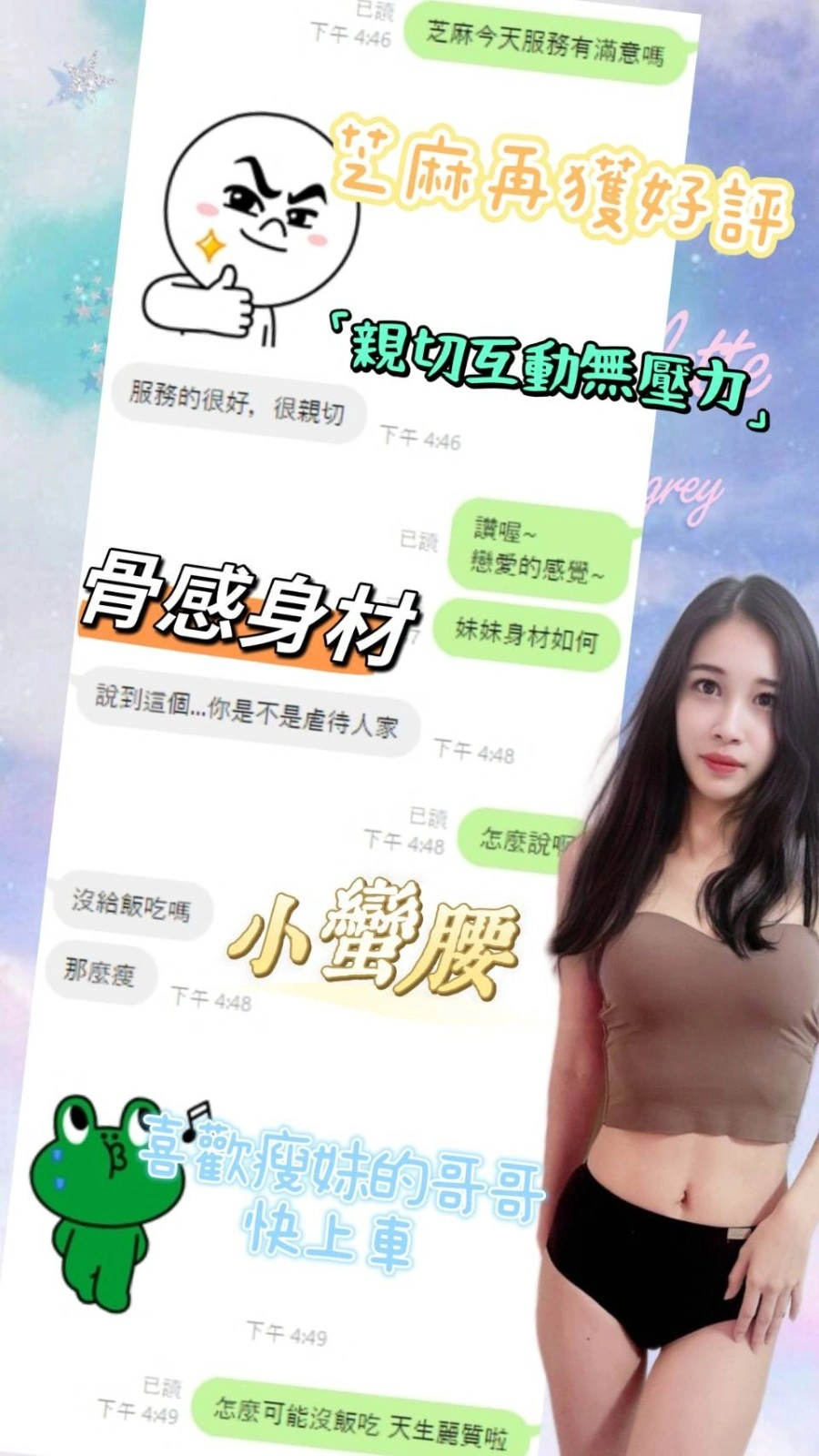 按摩,殘廢澡,可親嘴,無套吹,口爆,品鮑,輕功,奶推,顏射,快餐,2S,包夜