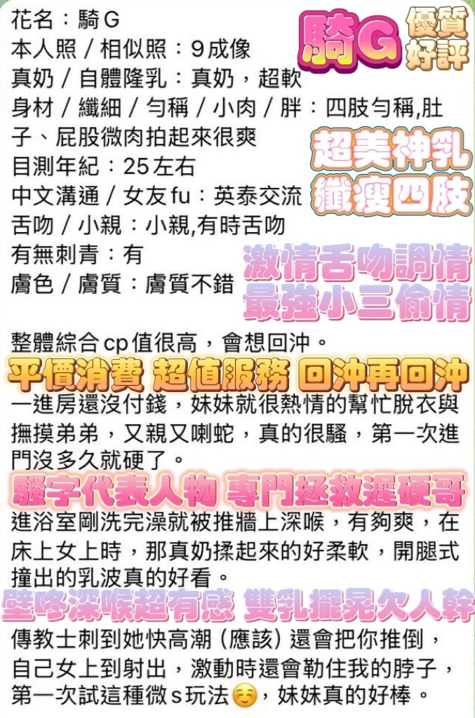 奶砲,按摩,69,殘廢澡,LG(舌吻)依氣氛衛生而定,可親嘴,無套吹,口爆,吞精,品鮑,舔蛋,奶推,無套做,無套內射,快餐,2S