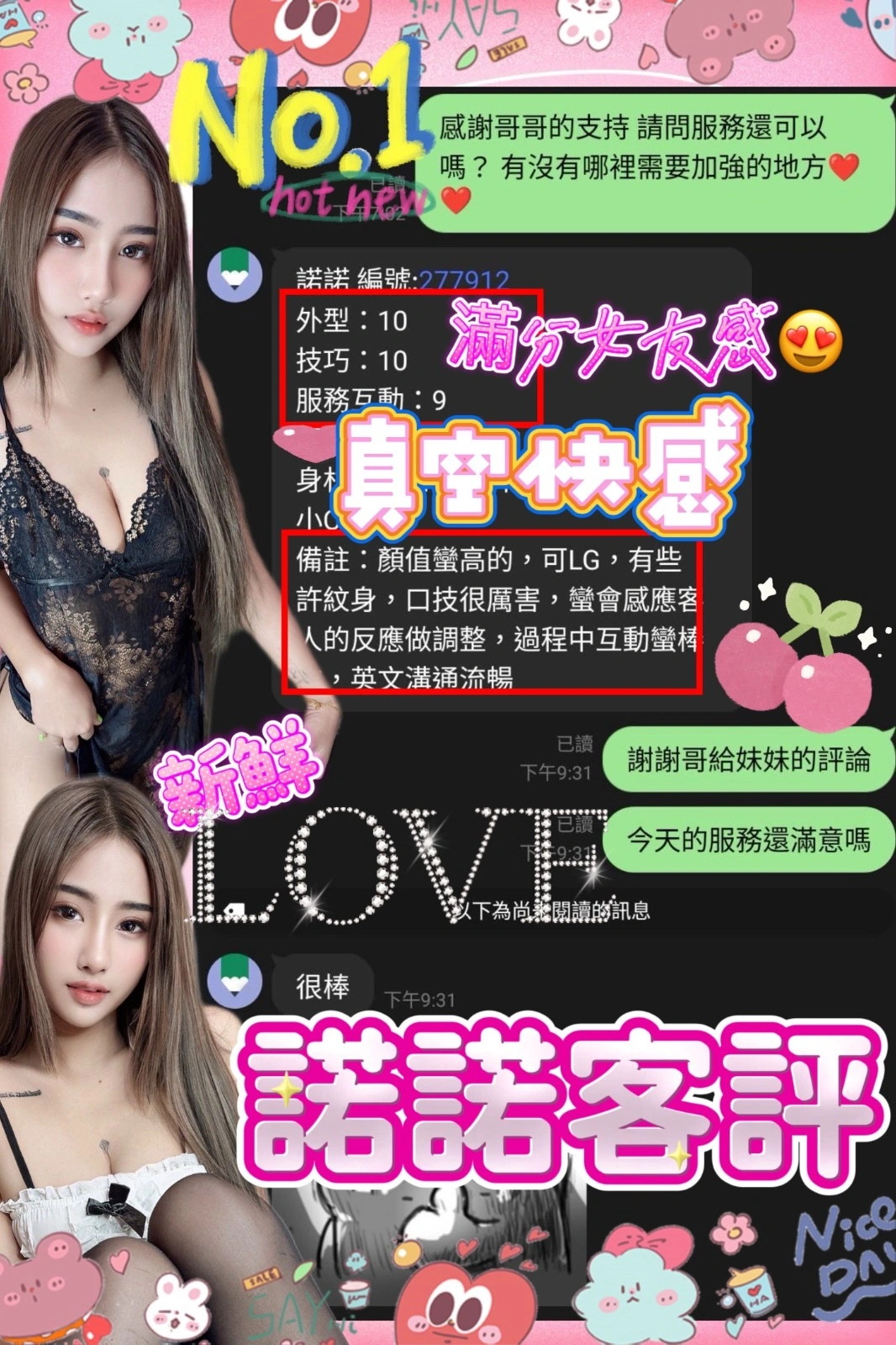奶砲,按摩,69,共浴,泰國浴,LG(舌吻)依氣氛衛生而定,可親嘴,無套吹,口爆,吞精,品鮑,舔蛋,奶推,屁推,冰火,顏射,絲襪(自備免付),玩具(按摩棒),玩具(跳蛋),情趣用品(客自備),快餐,2S,包夜
