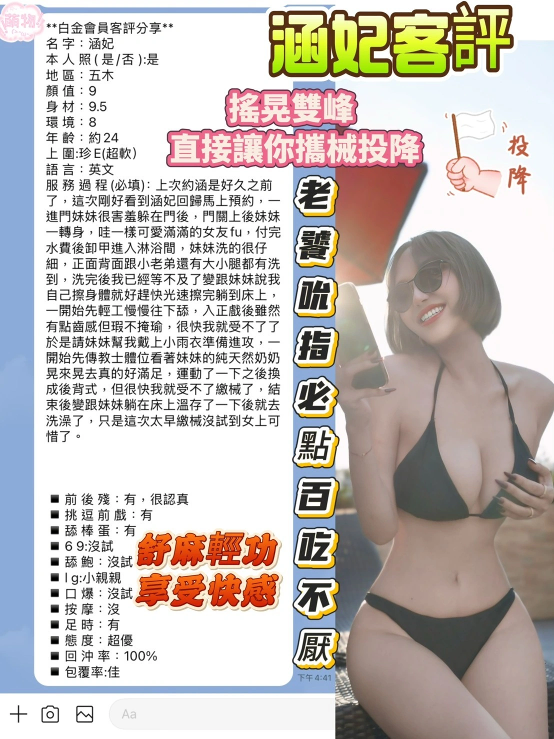 奶砲,按摩,69,共浴,可親嘴,無套吹,品鮑,舔蛋,奶推,屁推,變裝(自備免付),絲襪(自備免付),玩具(按摩棒),玩具(跳蛋),情趣用品(客自備),英文溝通,快餐,2S