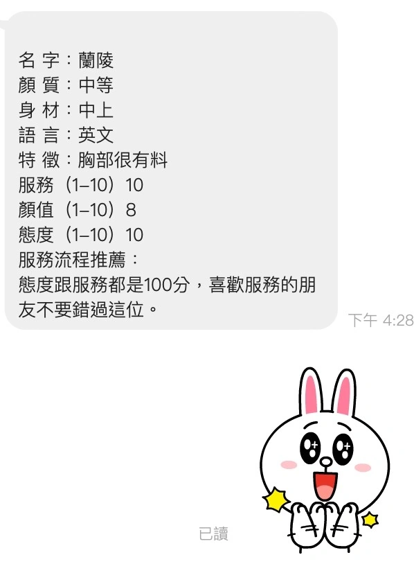 奶砲,毒龍,按摩,69,殘廢澡,LG(舌吻)依氣氛衛生而定,可親嘴,無套吹,口爆,品鮑,舔蛋,奶推,屁推,冰火,顏射,浴中蕭,變裝(自備免付),絲襪(自備免付),無套做,無套內射,後門,英文溝通,快餐,2S
