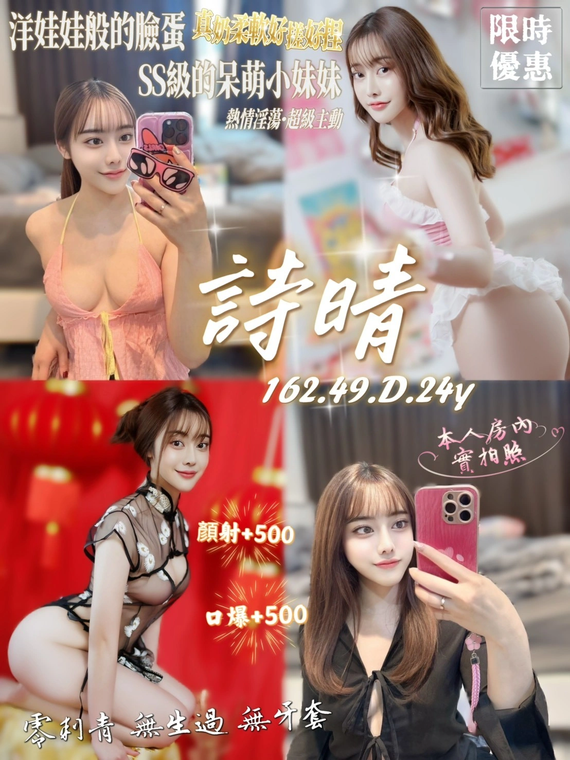 奶砲,按摩,69,殘廢澡,LG(舌吻)依氣氛衛生而定,可親嘴,無套吹,口爆,品鮑,舔蛋,奶推,屁推,顏射,深喉嚨,絲襪(自備免付),快餐,2S,NS